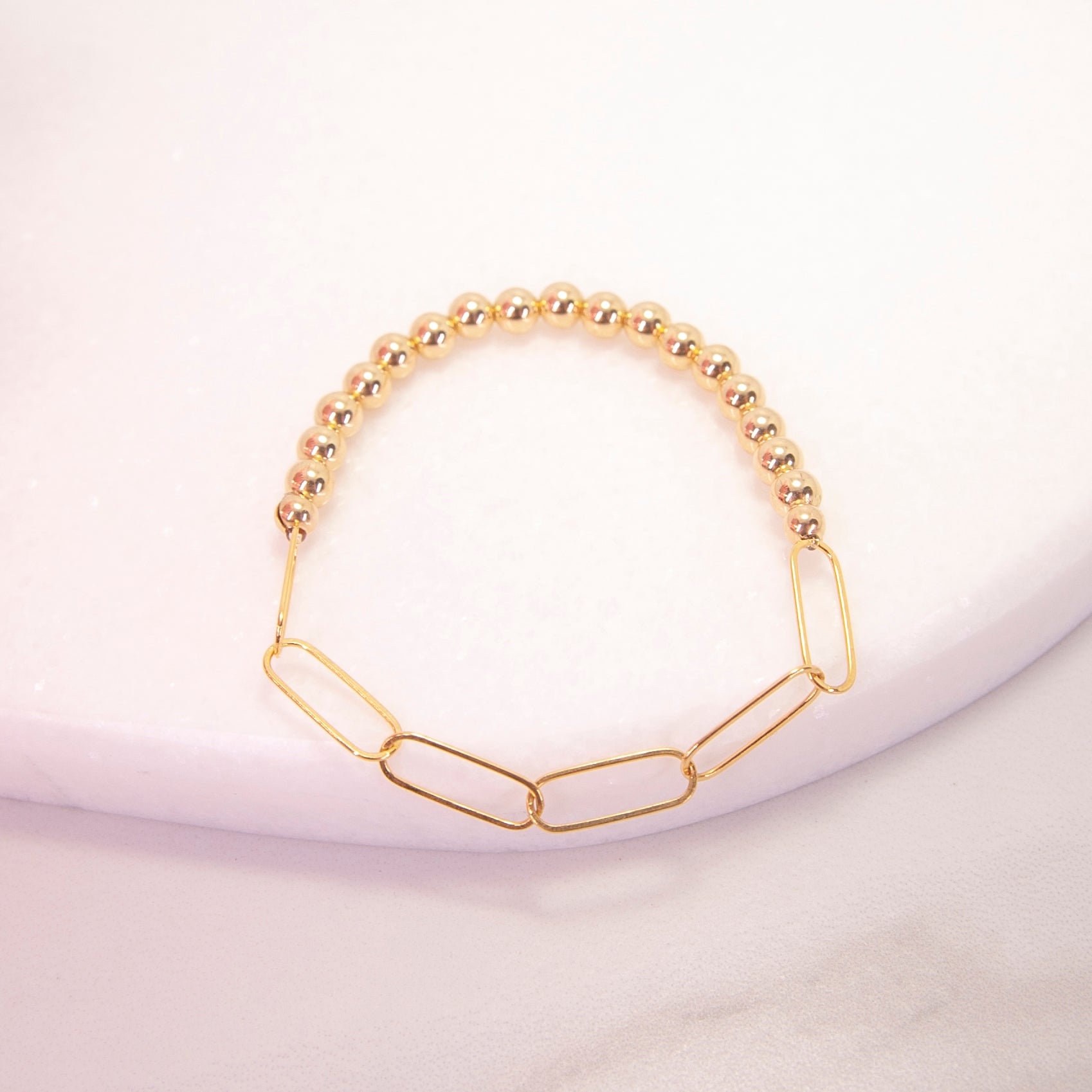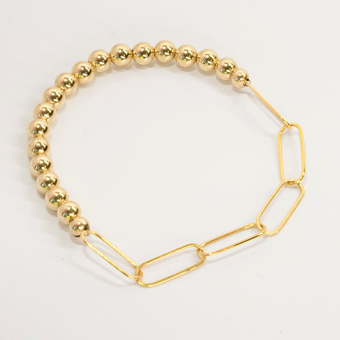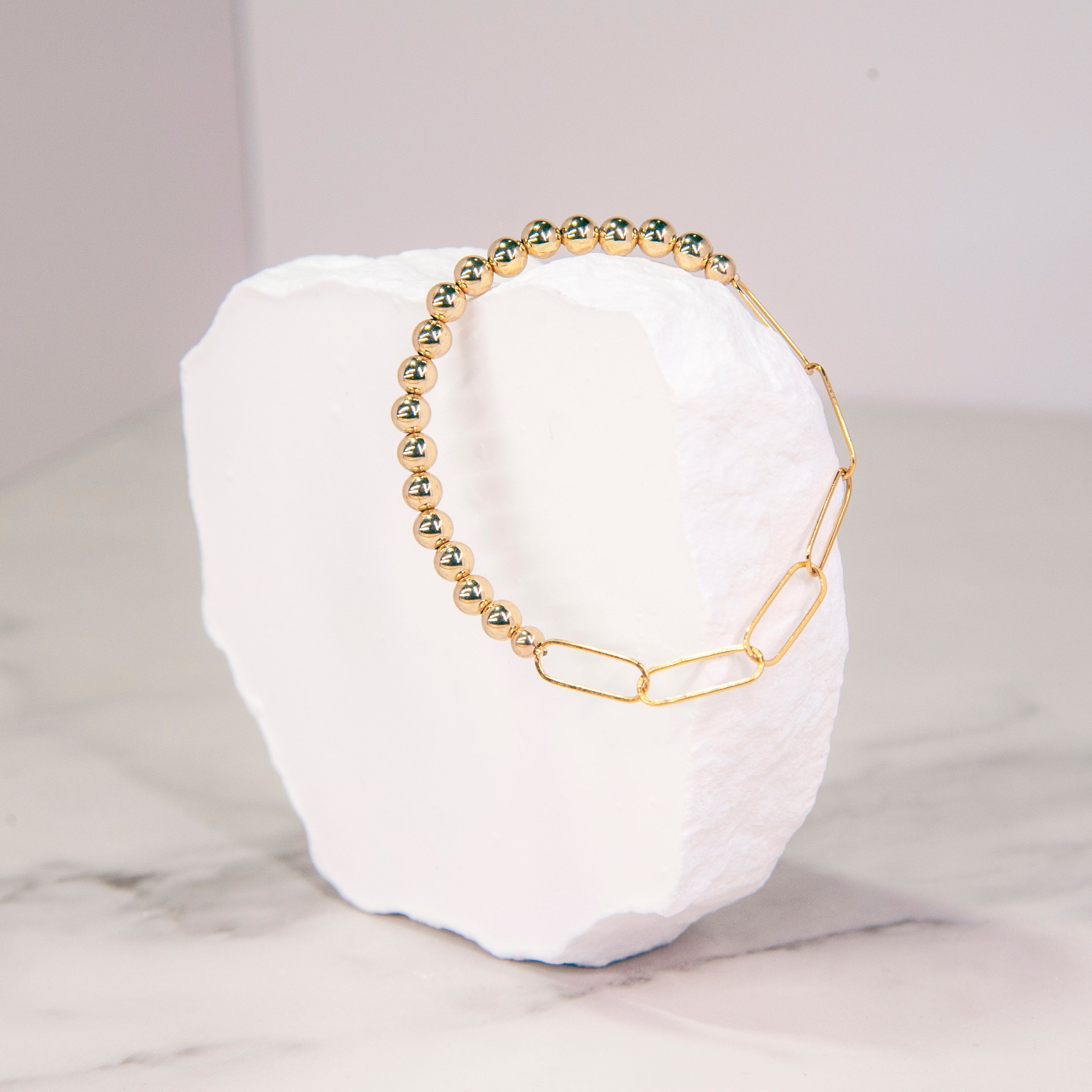 A unique spin on the classic gold beaded bracelet! Made with 5mm gold filled beads and gold filled paperclip chain, strung on a high quality elastic for effortless wear.  You can even add charms, as well, for an even more fun, trendy look!