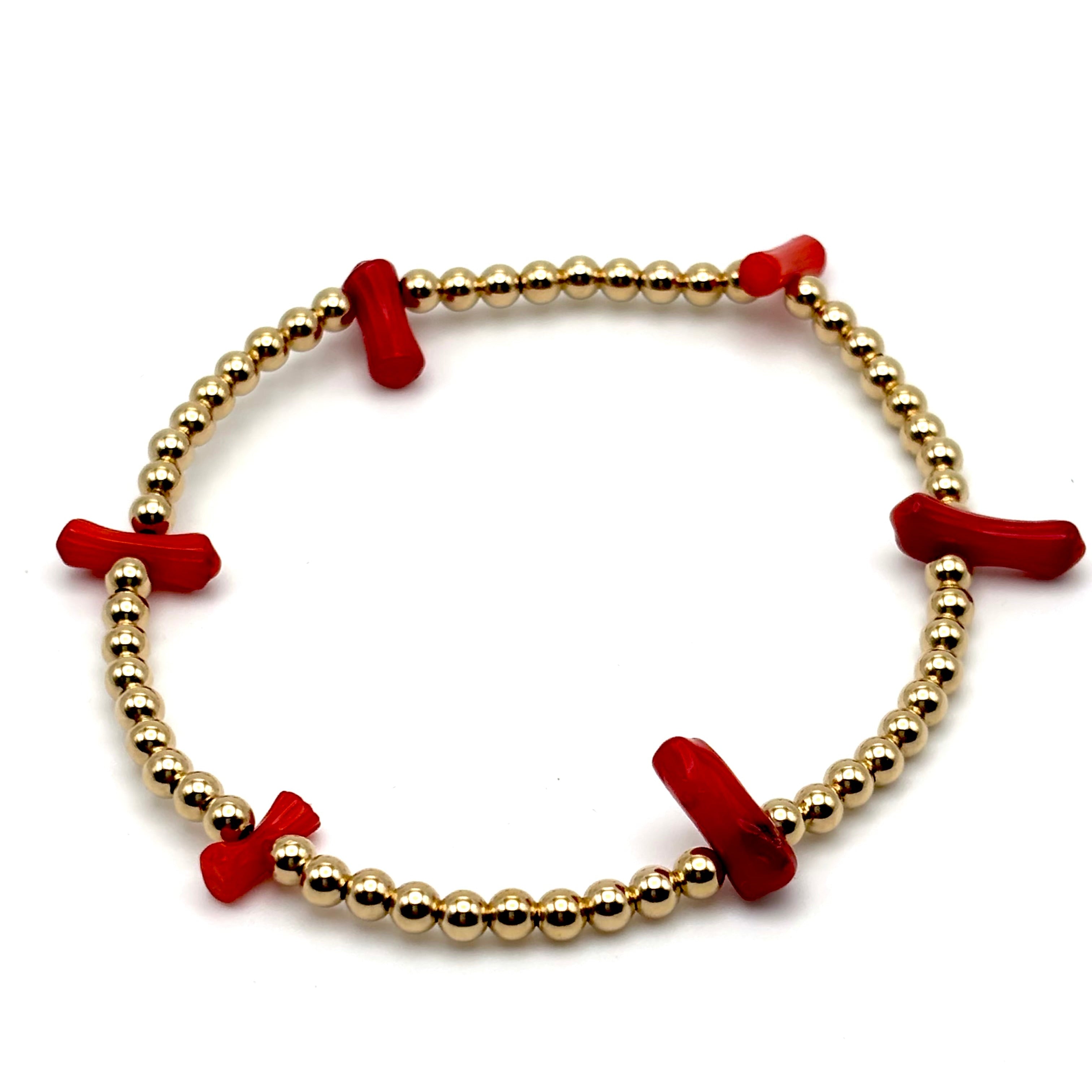 Made with red coral and 3mm gold filled beads, this bracelet adds the perfect pop of color to your stack and feels like summer all year round!