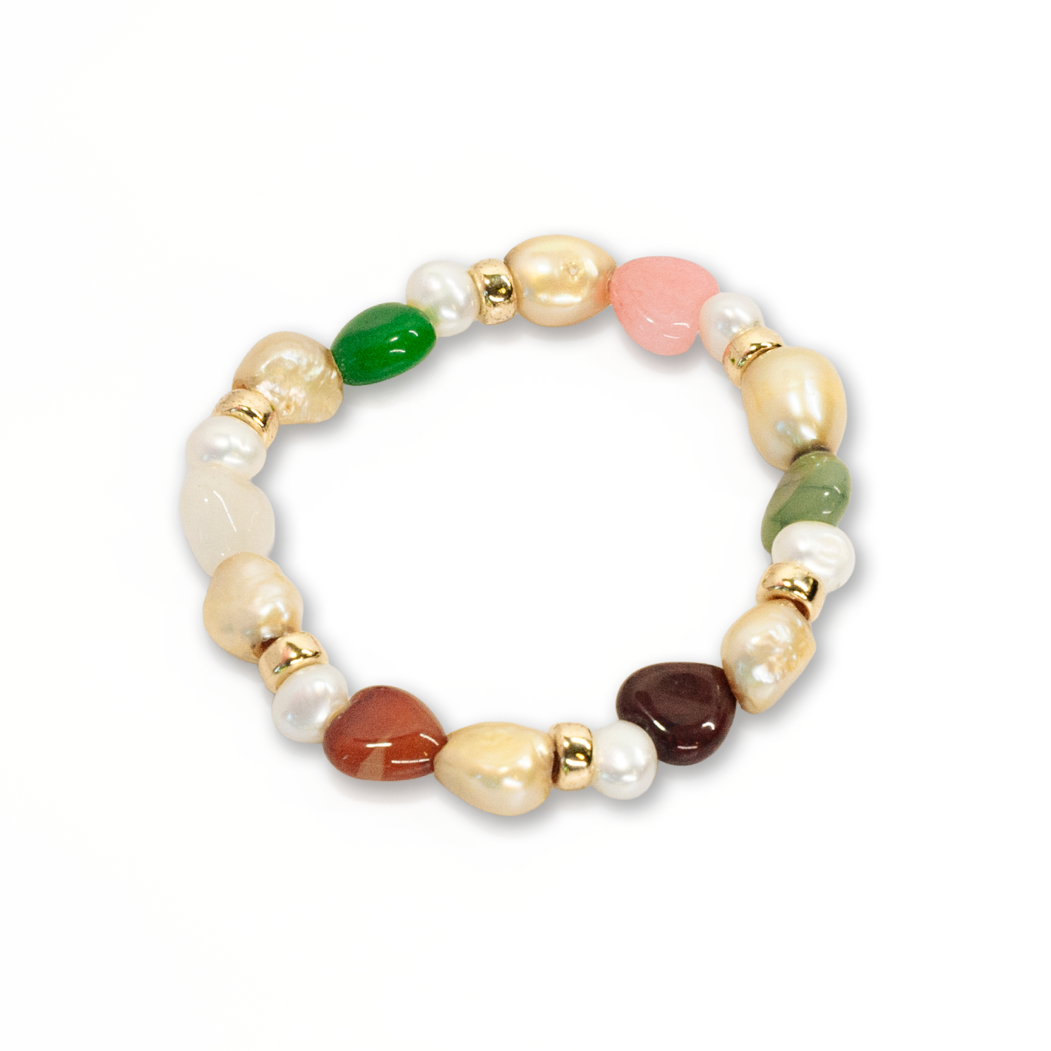 Made with pale gold and cream color freshwater pearls, heart gemstone beads, and gold filled roundel beads.  This bracelet is the perfect summer addition! Can be worn solo, but also looks great stacked with some of your other favs. ❤️