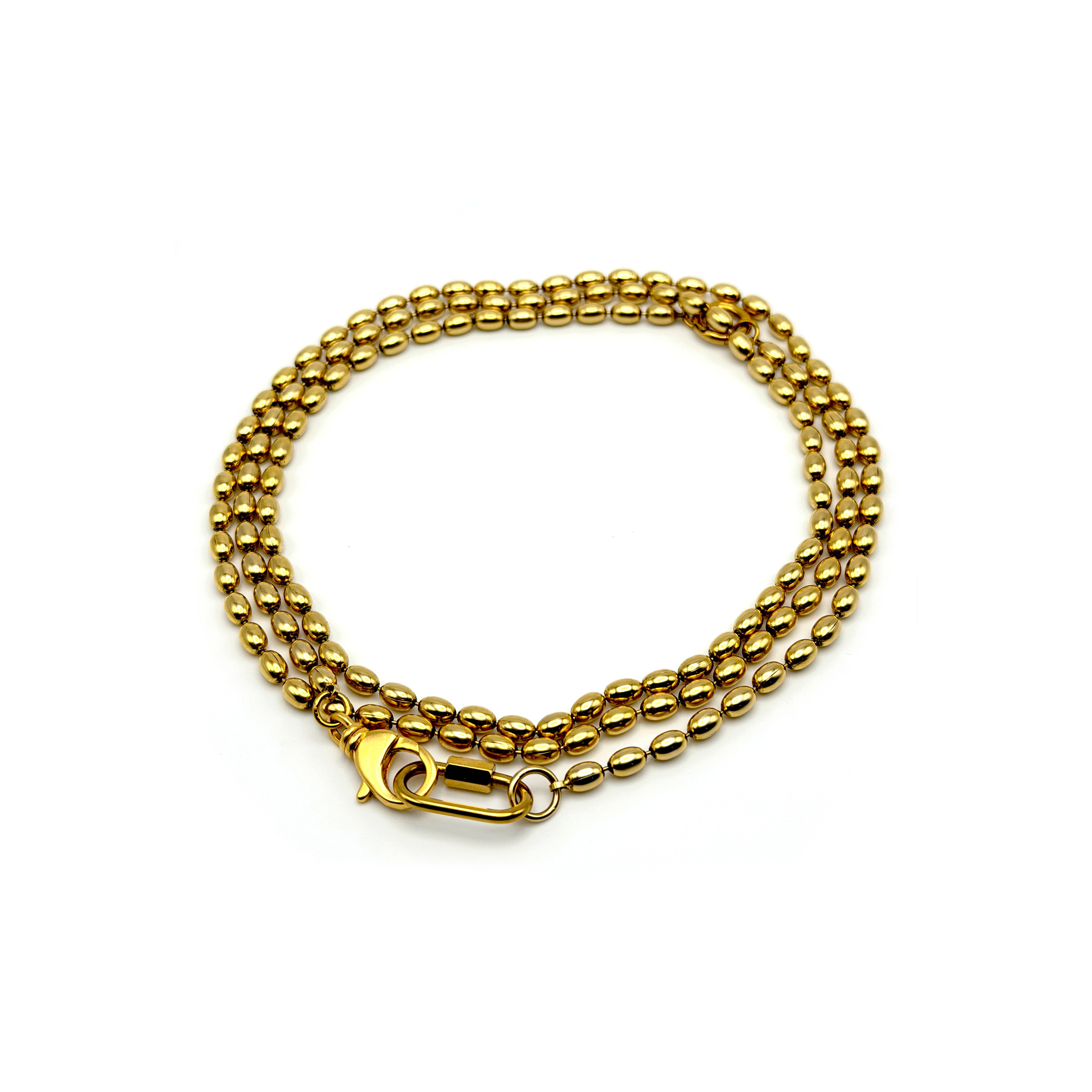 Made with (2) strands of 12K antique gold rice bead chain. Both chains are attached with a 12mm carabiner and also include an additional oval screw carabiner and large lobster clasp, allowing for charms to be added and interchanged. This necklace offers a multitude of styling options since you can wear one strand or two and add as many charms as you wish!
