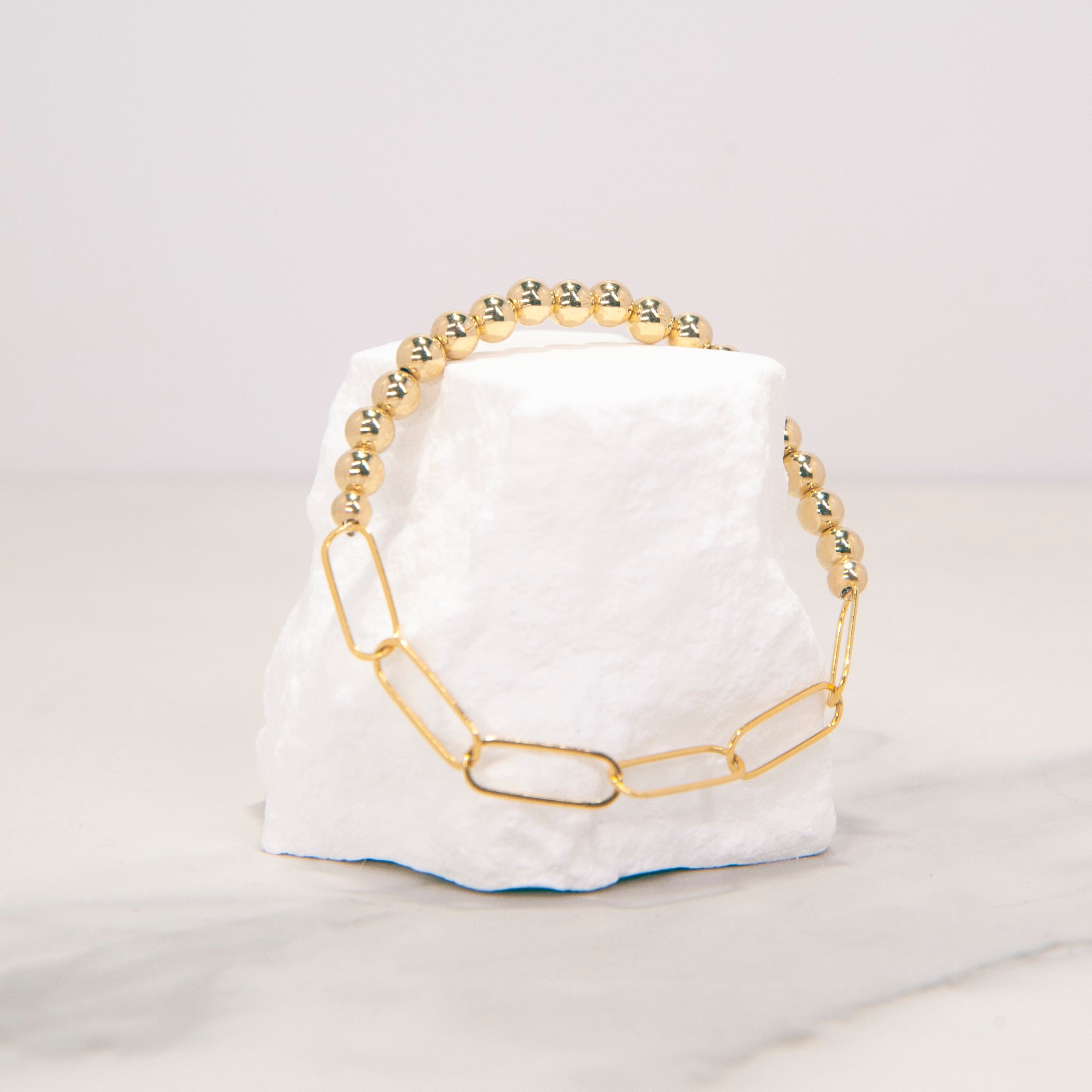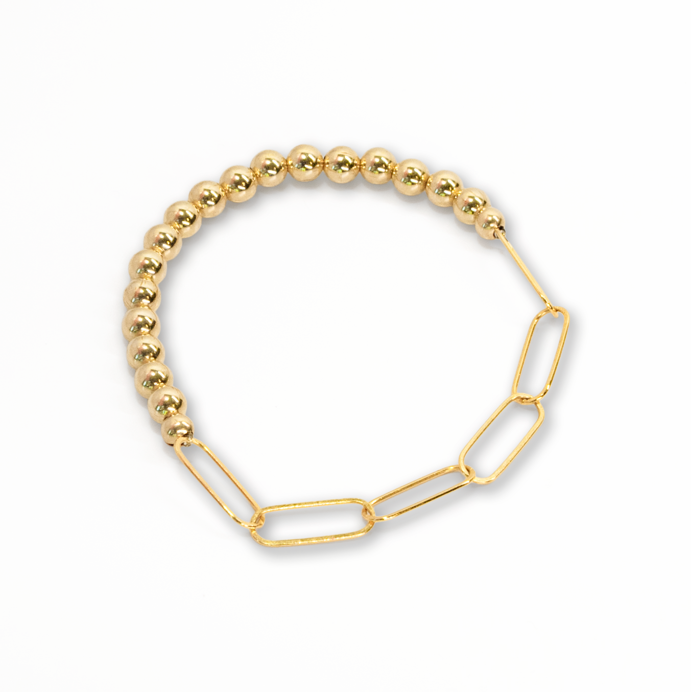 A unique spin on the classic gold beaded bracelet! Made with 5mm gold filled beads and gold filled paperclip chain, strung on a high quality elastic for effortless wear. You can even add charms, as well, for an even more fun, trendy look!