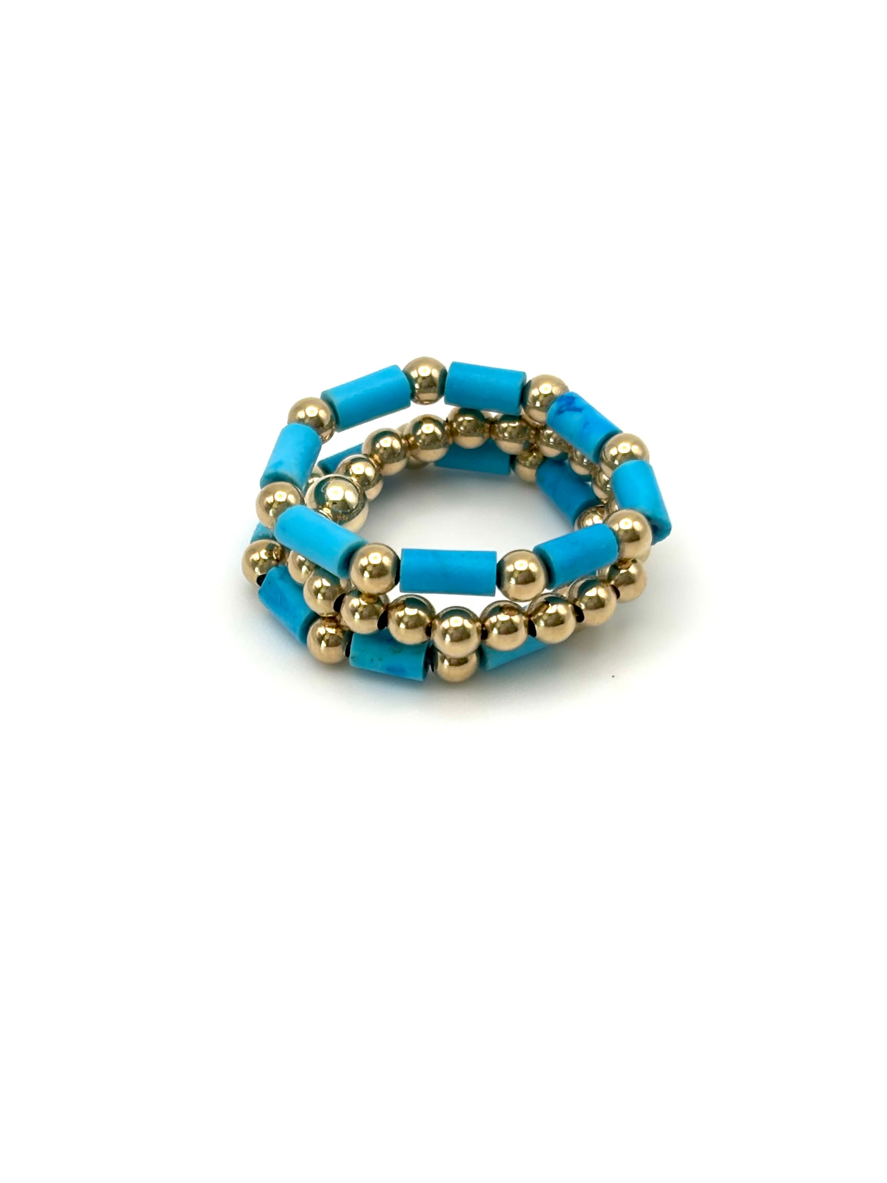 Made with blue afghan and gold filled beads. If you love the color blue, this stack is for you! Includes (2) blue/gold rings and (1) 3mm gold filled beaded ring.