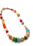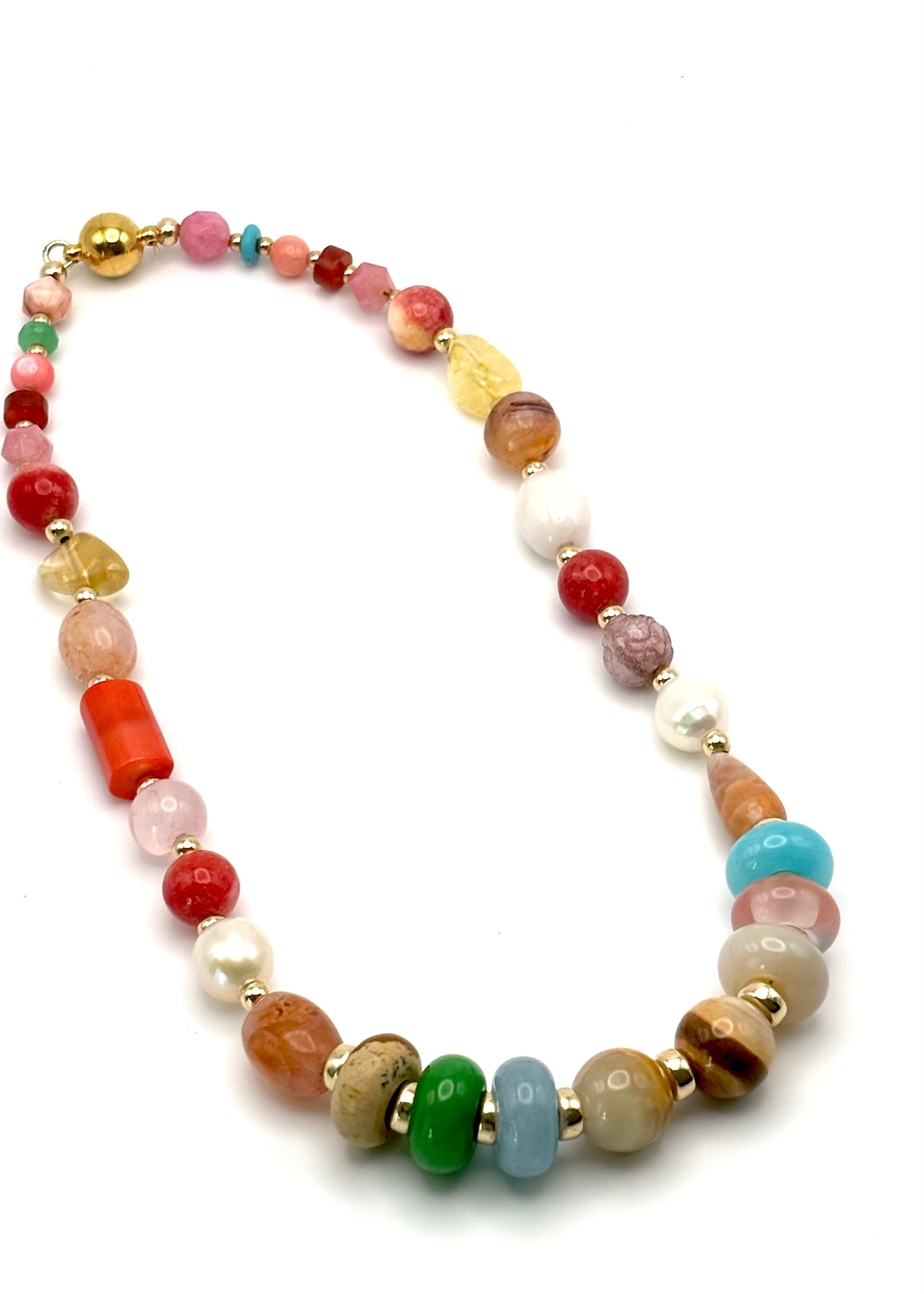 Made with mulit-color gemstones, pearl, and gold filled beads. This necklace layers beautifully and adds the perfect pop of color to your neck stack!