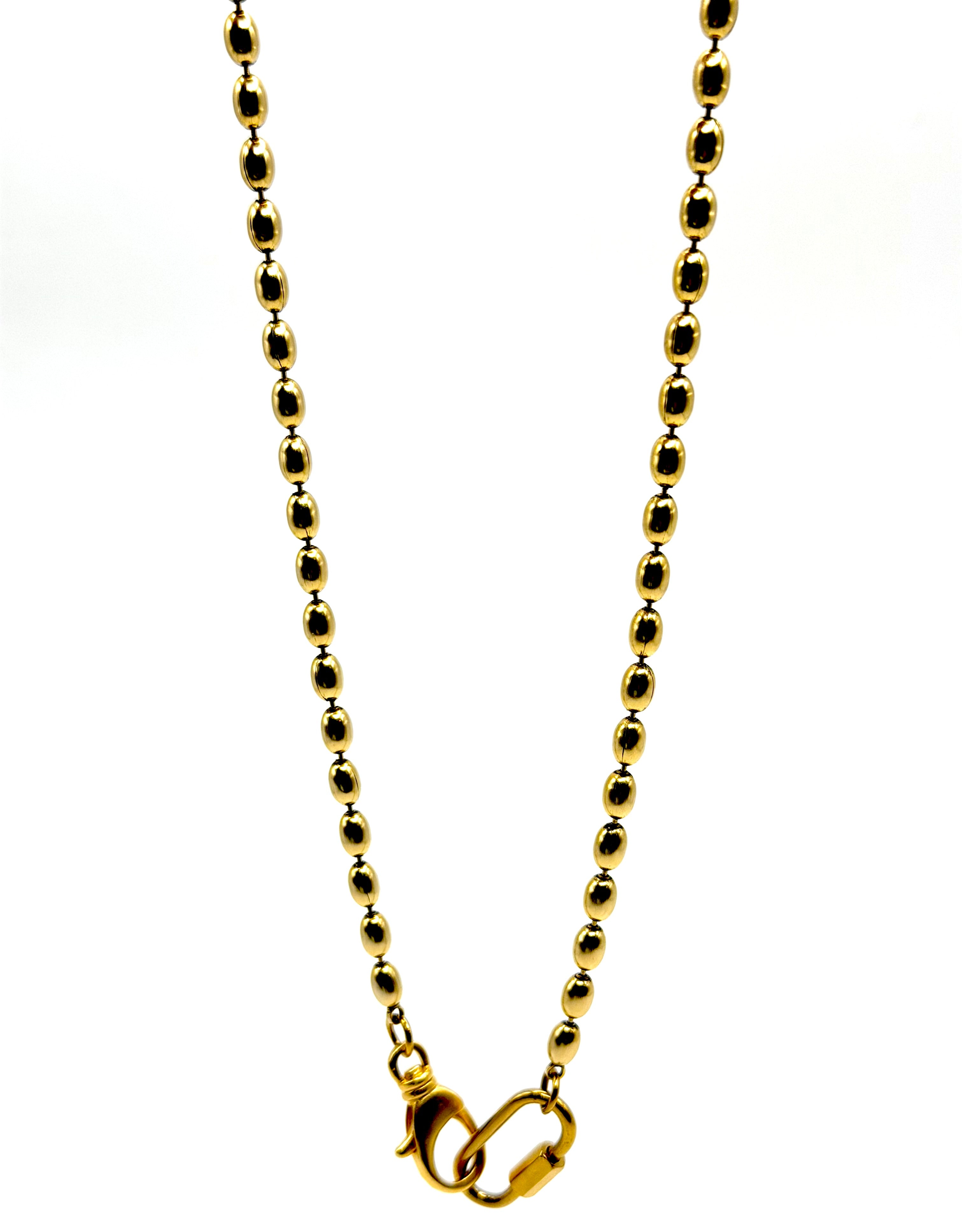 12K antique gold rice bead chain.  Includes a carabiner and large lobster clasp, which allows you to add/interchange charms.
