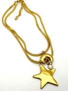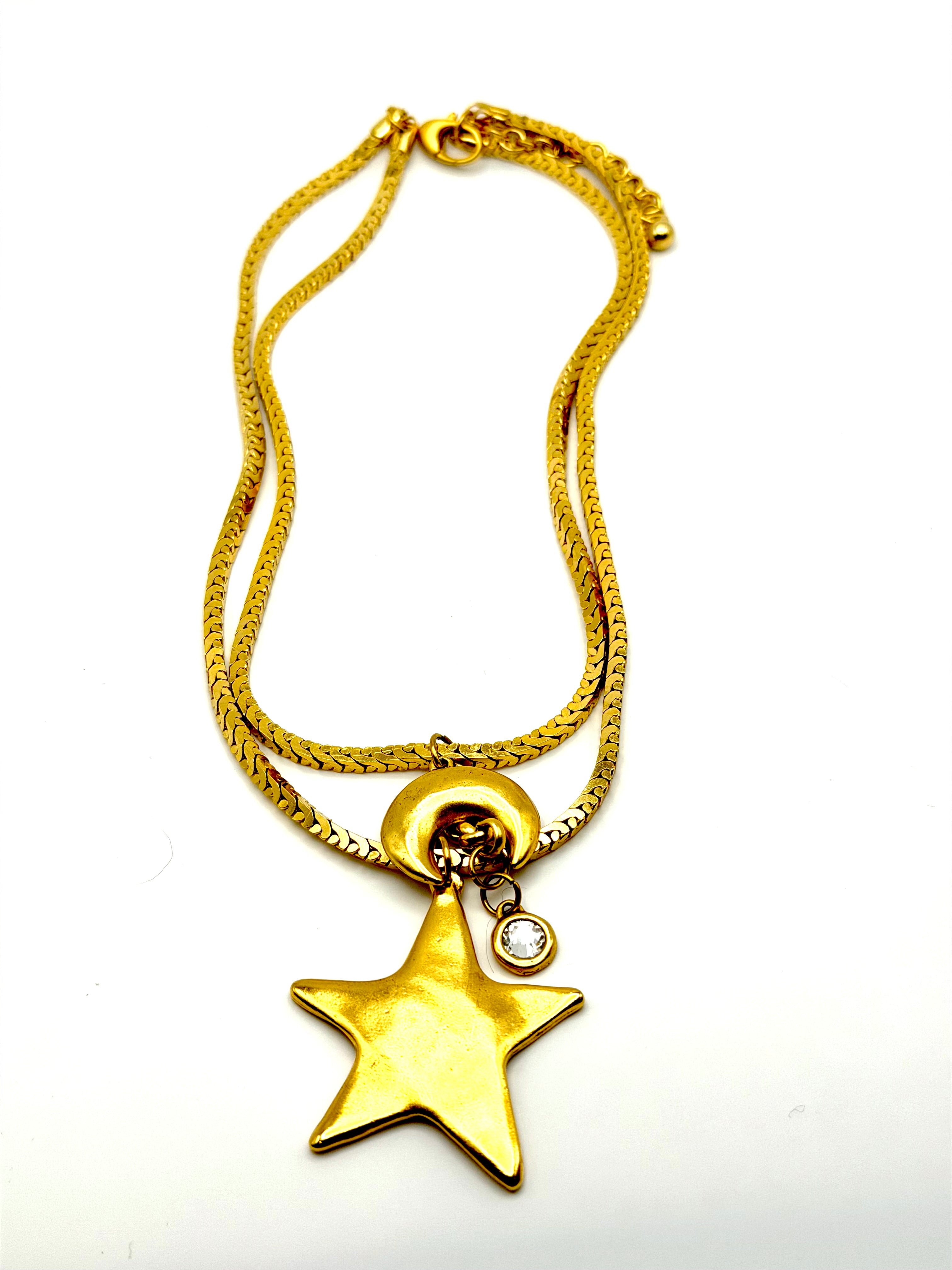 Made with 12K antique gold double strand herringbone chain with large gold star and crescent moon with rhinestone drop. This necklace makes the ultimate statement!