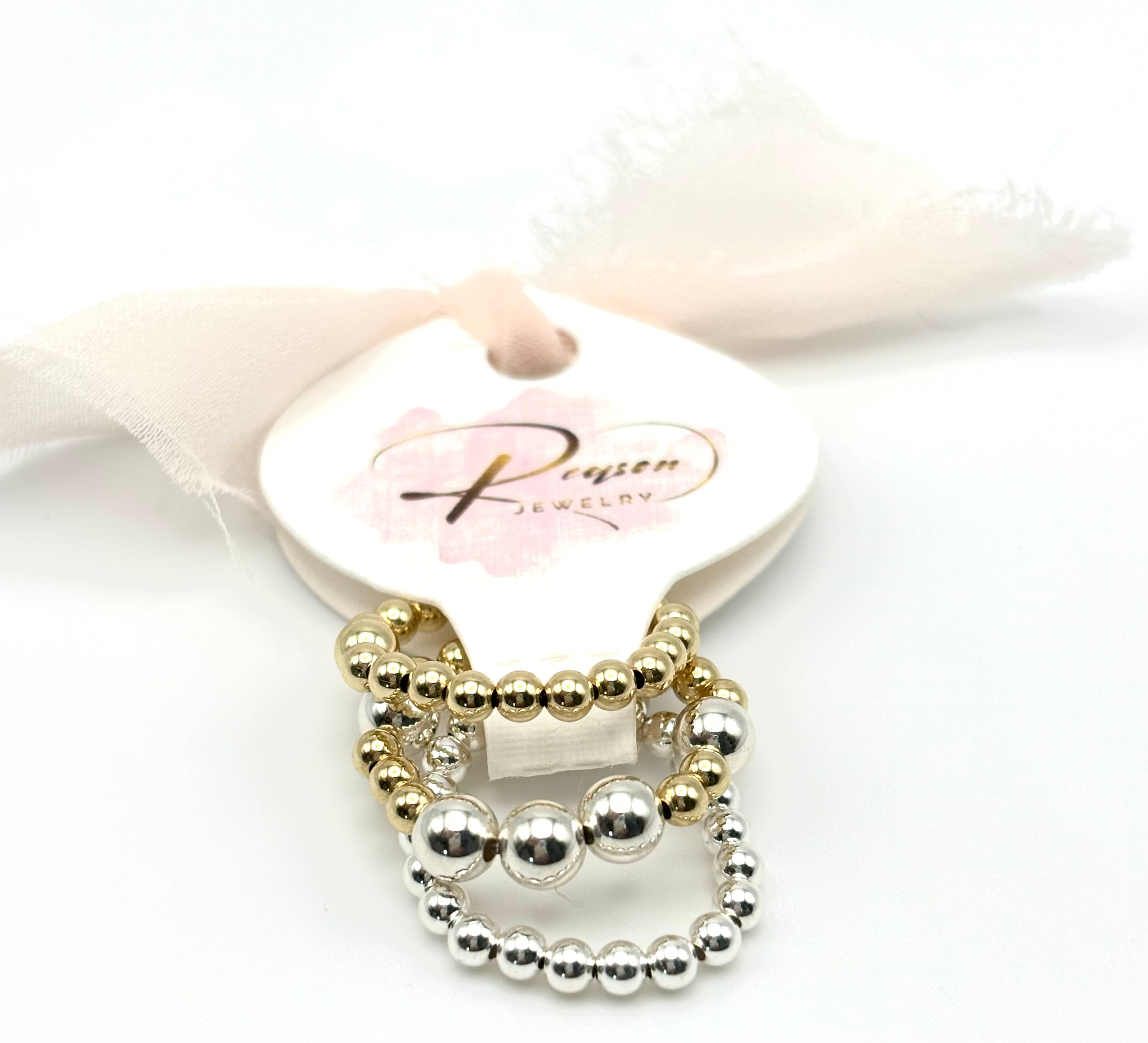 Includes (1) 3mm sterling silver ring, (1) 3mm gold filled ring, (1) 5mm silver/3mm gold beaded ring. This stack is a classic that allows you to take advantage of mixing your gold and silver jewelry! ❤️