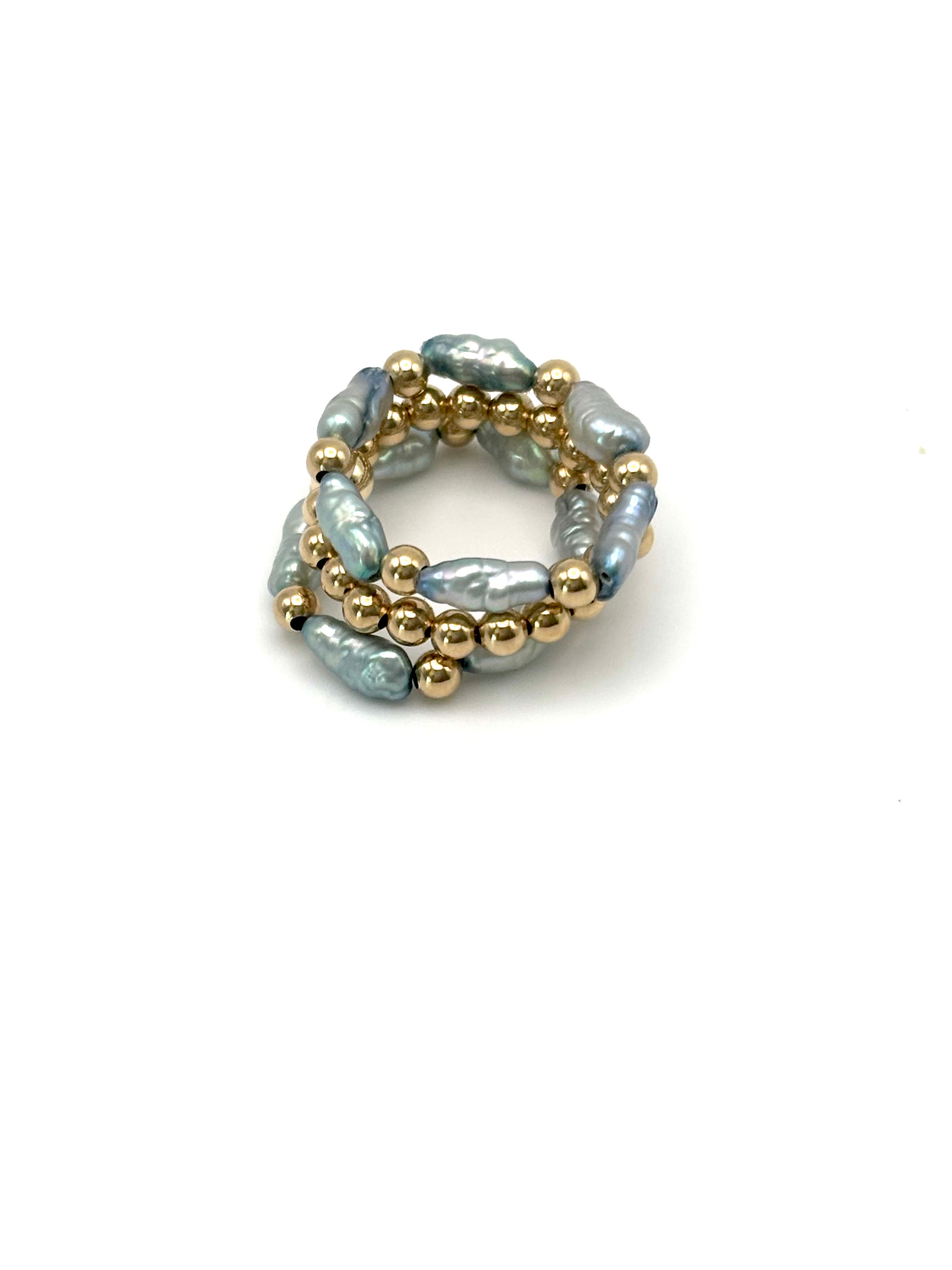 Made with japanese rice pearl beads and gold filled beads. If you are a pearl lover, this stack is for you! Includes (2) pearl/gold rings and (1) 3mm gold filled beaded ring.