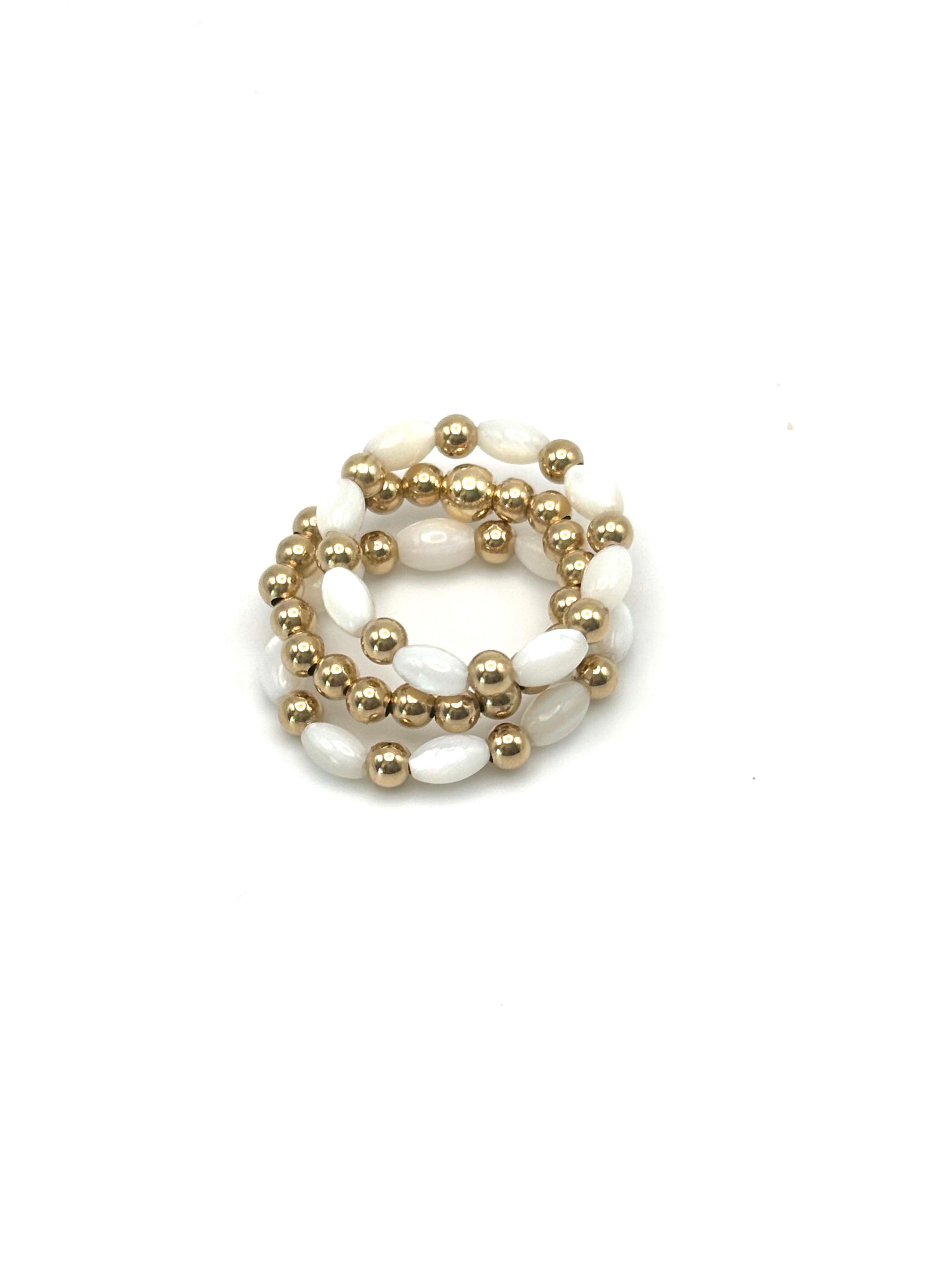 Made with white shell and gold filled beads. This stack defines summer! Includes (2) shell/gold rings and (1) 3mm gold filled beaded ring.